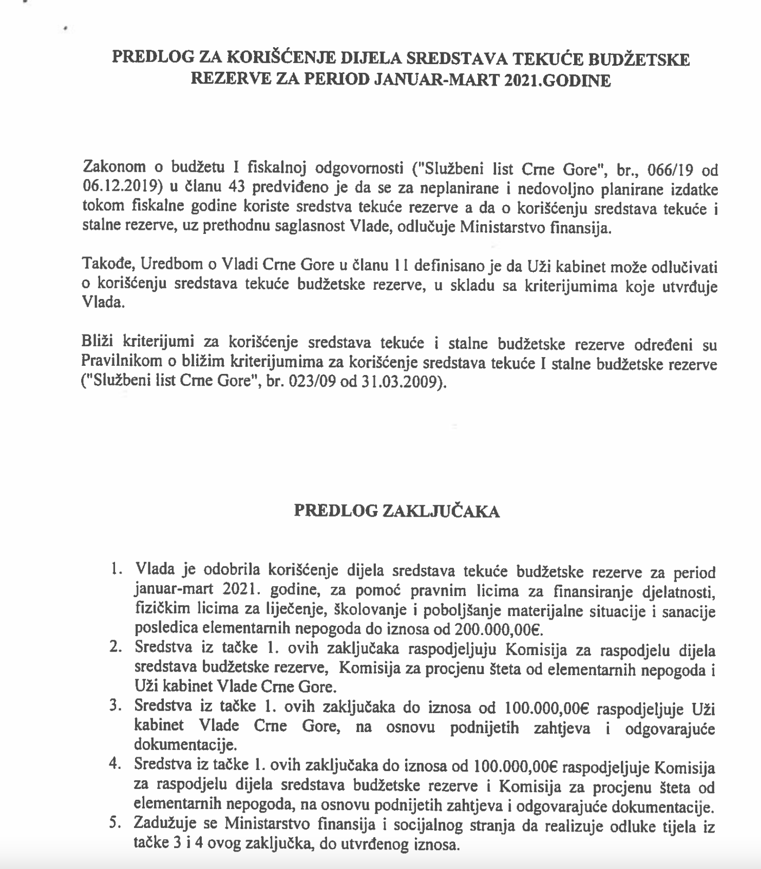 Zaključak o korišćenju tekuće budžetske rezerve
