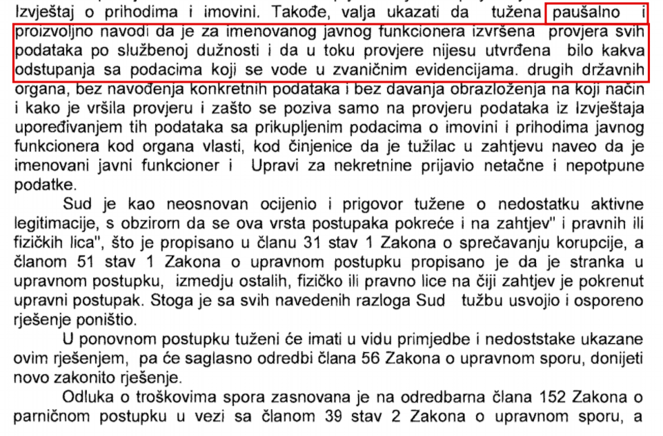 Iz MANS-a napominju da je Upravni sud, u periodu od septembra prošle do februara ove godine, poništio više odluka ASK-a kojima je ova institucija odbila da se bavi slučajevima nezakonitog bogaćenja visokih javnih funkcionera. Presudama je ASK-u naloženo da najkasnije u roku od 30 dana donese nova, zakonita rješenja, što se nije desilo.