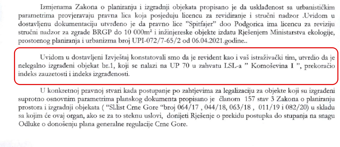 U odgovoru na pitanje Istraživačkog centra MANS-a iz budvanskog sekretarijata za urbanizam su potvrdili da su Mitrovići prekoračili uslove iz plana u koji treba da se uklopi njihov objekat.